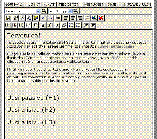 Otsikoilla määrätään myös sivujen sijoituksesta. H1 on pääotsikko, eli jokaisen sivun otsikko. Valitse valikosta H1 otsikon kooksi, jos haluat tehdä pääotsikon tai uuden pääsivun. Mikäli haluat esimerkiksi Tervetuloa-sivun jälkeen seuraavaksi tulevan esim. Tapahtumat-sivun, niin tee Tervetuloa-sivun tekstien jälkeen otsikko (H1) Tapahtumat ja tallenna muutokset. Tämän jälkeen Tervetuloa-sivun jälkeen ilmestyi uusi sivu ”Tapahtumat”.