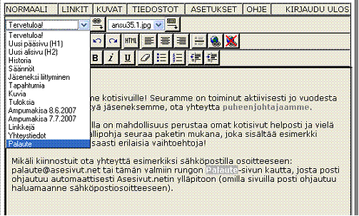Mene joko kohtaan kuvat tai tiedostot. Liitä kuvat/tiedostot etsien ne ensin koneeltasi ja lähettämällä ne palvelimelle. Tämän jälkeen voit liittää ne sivuille menemällä editoriin, viemällä kursorin haluttuun kohtaan valitsemalla listasta oikean kuvan ja painamalla listan vieressä olevaa painiketta.