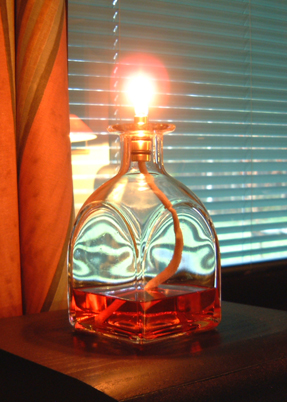 viinipullon, jonka täytin puoleen väliin valopetroolilla. ”Polttoaineena” lampussa käytetään